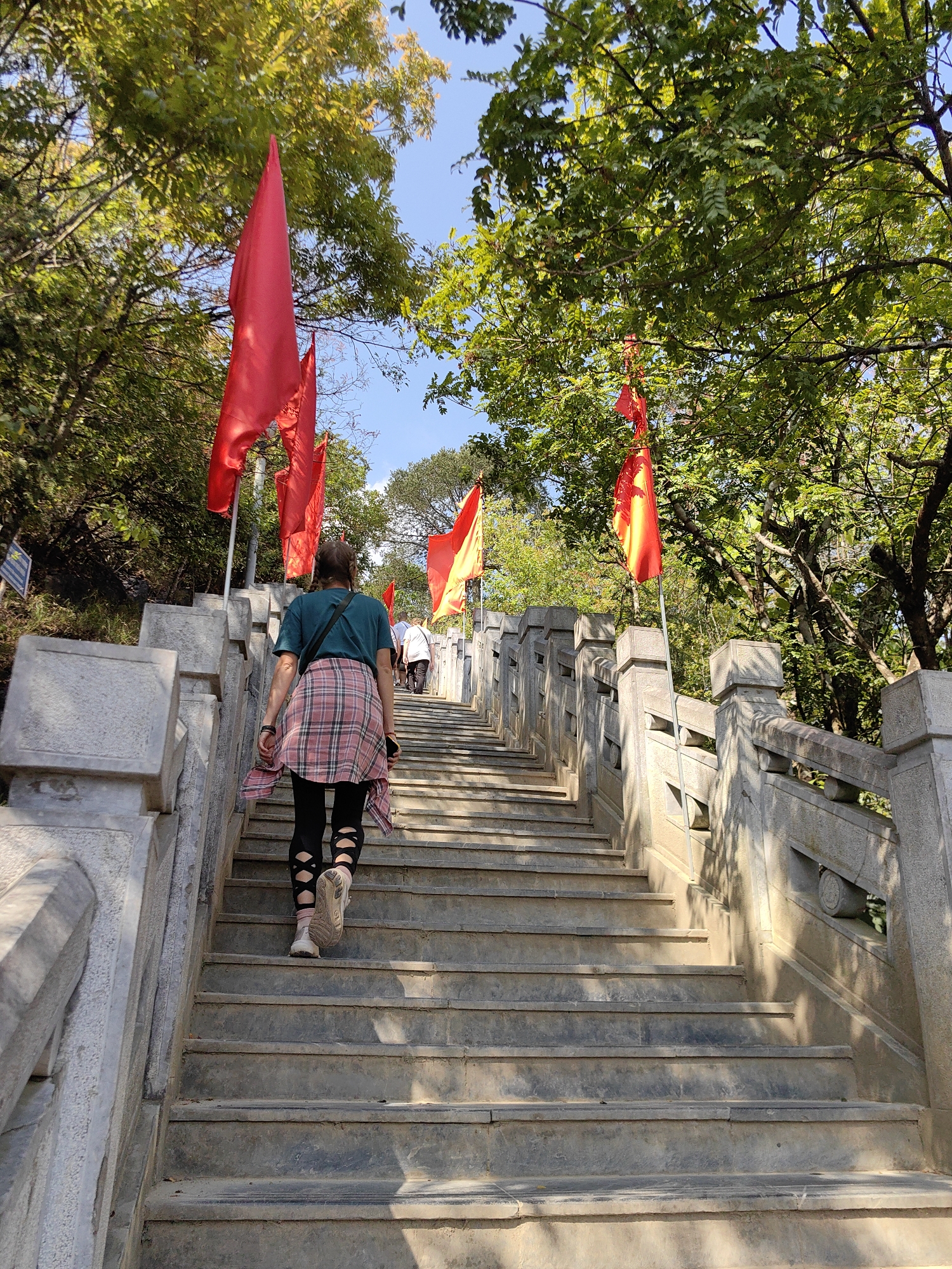 A woman walks uphill on a long, concrete stairway with ornate concrete balustrades on either side. Several red flags are spaced along the staircase. Other people are seen further uphill. The location may be Lũng Cú Commune, Vietnam. Trees line both sides of the staircase and overhead, with blue sky visible in the background. The woman is wearing a green t-shirt, black leggings with cutouts, sneakers, and has a plaid shirt tied around her waist.