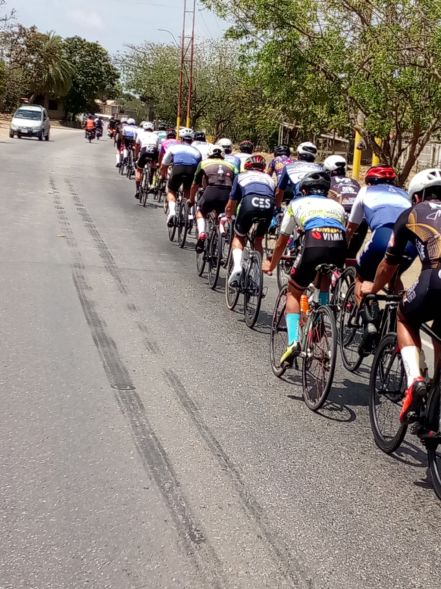 A group of cyclists rides on a road in San Juan Bautista, Venezuela