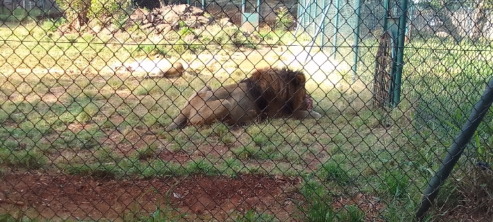 The image displays two lions observed through a chain-link fence within an enclosure, located in Athi River ward, Kenya