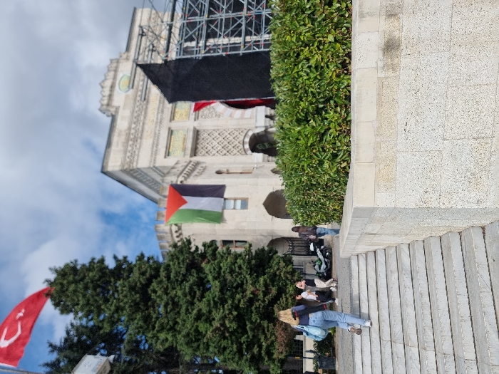 The image depicts the main entrance of Istanbul University, specifically the Beyazıt Gate, situated in Istanbul, Turkey. The scene is illuminated by daylight under a partly cloudy sky. A red Turkish flag with a white crescent and star flies from a flagpole in the upper left corner. A Palestinian flag, characterized by horizontal black, white, and green stripes with a red triangle at the hoist, hangs vertically from a window on the ornate, light-colored stone facade of the university building. To the right of the building, a large black-covered scaffolding structure is present. In the foreground, wide, light-colored stone steps ascend towards the left, alongside a stone planter topped with dense green bushes on the right. Approximately five individuals are visible in the midground; one woman with blonde hair, dressed in blue jeans and carrying a light blue bag, walks up the steps with her back to the viewer. Other individuals are seen walking or standing near the base of the university building. A green scooter is parked near the base of a tall evergreen tree located to the left of the building.