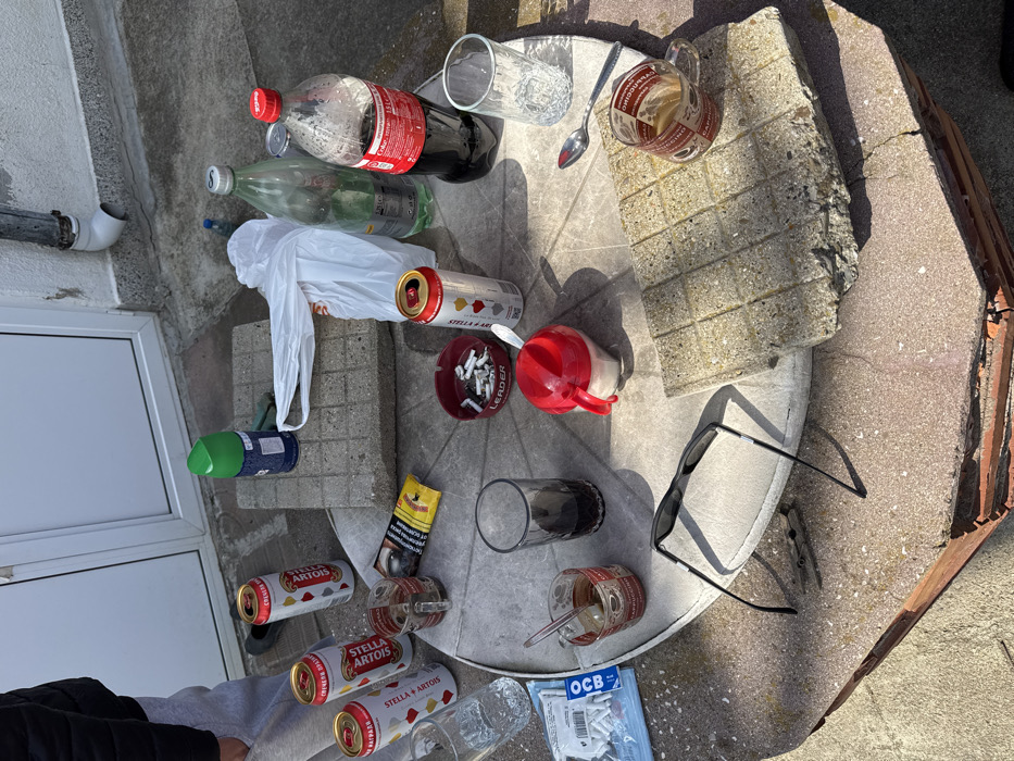An outdoor scene in Sotirya, Bulgaria, depicts a collection of discarded and in-use items on and around a stone or concrete table, illuminated by direct sunlight. **Location:** The setting is an outdoor patio or courtyard against a light-colored building wall. A white door or window frame with a handle is visible in the background, along with a grey downspout affixed to the wall. The ground consists of light grey paving stones. **Objects and Arrangement:** The central feature is a roughly circular, rustic stone or concrete table with a textured surface. On the table, various items are scattered, suggesting recent or ongoing consumption: * **Beverages:** Four partially consumed or empty 0.5-liter Stella Artois beer cans, some with a red heart design, are present. A 1.5-liter plastic Coca-Cola bottle, partially full, stands near an empty clear green glass bottle. * **Drinking Vessels:** Two clear glass mugs with "CAPPUCCINO" branding; one contains a spoon and brown residue, the other is mostly empty. Two additional clear glass tumblers are visible, one empty, one containing a dark liquid. A dark, opaque glass or plastic cup also contains a dark liquid. * **Smoking Paraphernalia:** A red circular "LEADER" branded ashtray is filled with numerous cigarette butts and ash. A yellow and black cigarette pack, displaying a Bulgarian health warning, lies open next to a clear plastic bag containing OCB brand cigarette filters. * **Other Items:** A red-topped, white-based sugar dispenser with a small spoon is on the table. A pair of black sunglasses, folded, rests near the table's edge. A crumpled white plastic bag and a green aerosol can are positioned on a separate concrete block next to the table. A loose silver spoon is also present. **People:** The lower torso and legs of an individual wearing grey sweatpants and a dark jacket are visible in the upper left of the frame, indicating human presence near the table. No direct actions or interactions are depicted for this individual. **Environment:** The ground around the table is paved with large, light-colored concrete squares. The strong sunlight casts sharp shadows from the objects, indicating a clear, bright day.
