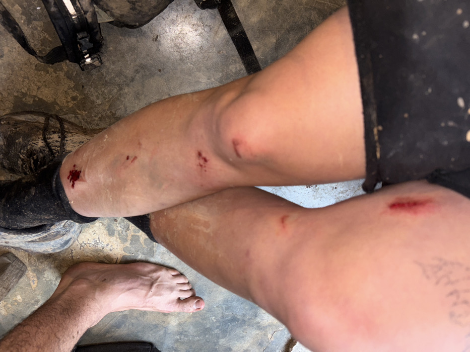 The image provides an overhead view of two human lower bodies, primarily legs and feet, positioned on a dirty, mottled concrete or paved surface in Pai, Thailand. The primary subject's legs are in the immediate foreground, heavily soiled with dried mud and presenting multiple acute injuries. The subject's left leg (on the viewer's right) is encased in a muddy black sock and a heavily soiled black shoe or boot. This leg shows a prominent bleeding abrasion on the shin just below the knee, along with several smaller red abrasions on the calf and knee area. The subject's right leg (on the viewer's left) is bare from mid-thigh, revealing a significant, actively bleeding linear laceration on the lower outer thigh and a minor abrasion near the knee. A faded dark tattoo is visible on the upper right thigh. The lower hem of black shorts is visible at the top of this thigh. To the far left, a clean, bare human foot and lower leg, belonging to a secondary individual, are present. This foot appears uninjured. On the far right, near the muddy boot, a dark, muddy object resembling a section of a bag or backpack with a visible zipper mechanism is partially visible. The ground surface is extensively stained with dirt and mud, suggesting an outdoor or semi-outdoor setting.