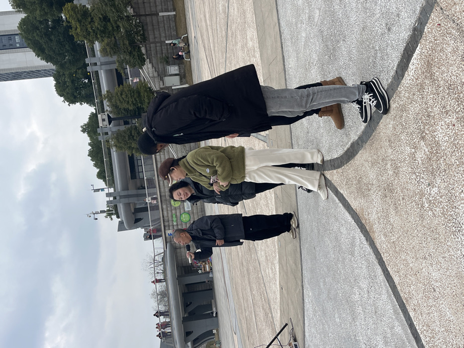 The image depicts an outdoor urban plaza in Banan, China, under an overcast sky. In the foreground, a group of four individuals is gathered on a patterned paved surface. On the left, an older Asian male, dressed in a dark jacket and pants, holds a silver microphone to his mouth, appearing to vocalize or speak. To his right, an Asian female in a dark puffer jacket and another Asian female in a green fuzzy jacket, a brown cap, and light-colored wide-leg pants are positioned, facing towards the male. Furthest to the right, a person is seen from the back, wearing a long black puffer coat, grey jeans, and black-and-white sneakers. Another person's brown boots are partially visible to the right of this individual. In the mid-ground, a modern architectural structure with curvilinear elements, railings, and integrated greenery on its upper level is visible. Several small figures are standing on this elevated walkway. To the right, a concrete staircase leads upwards, and a few individuals are seated on a bench further back. The background features a tall, light-colored high-rise building against the uniformly gray sky, with additional trees and landscaping around the structures.