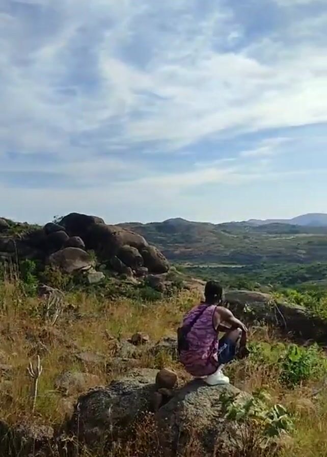 hilly landscape under a partly cloudy sky. In the foreground, there are rocks and dry grass. Two people are visible: one stands wearing a red shirt and the other is squatting on a rock, wearing a pink and purple tank top and a backpack. The person squatting is facing the landscape. The landscape includes green vegetation and distant mountains. Someone appears to be taking a photo.