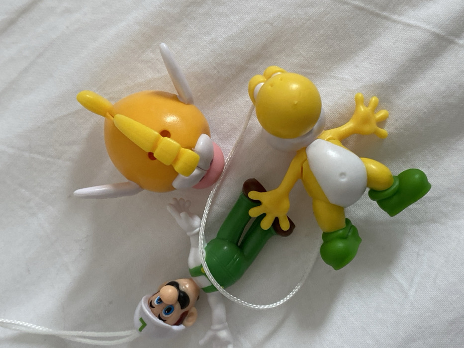 The image displays three plastic toy figures on a white, lightly wrinkled fabric surface. The first figure, located in the upper left, is Luigi from the Super Mario Bros. franchise, depicted in green overalls, a white shirt, and a white hard hat with a green "L." A thin white string is attached to this figure. Adjacent to Luigi, in the upper right, is a yellow, spherical, bird-like character with white wings, a yellow beak-like protrusion, and white cheeks with a pink tongue; this figure also has a white string attached. Below Luigi and to the right, the third figure, resembling a yellow Koopa Troopa with a white shell-like back and green boots, lies on its back. The strings from the Luigi and bird-like figures are partially intertwined. All figures are static and positioned horizontally or supine on the fabric. The environment is a generic indoor setting. The image provides no visual indicators to identify its location as Skala, Greece.