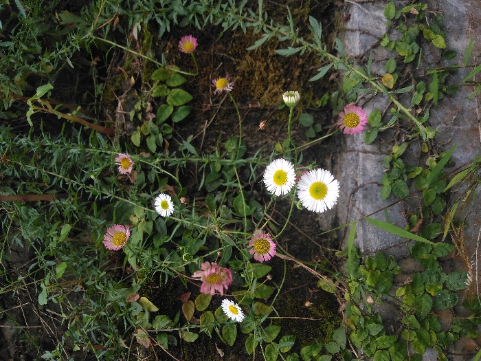 The scene depicts a close-up of dense vegetation and blooming flowers along a retaining wall in Chupaderos, Mexico. The image is dominated by various green plants, including slender-stemmed flora with linear leaves, small broad-leafed vines clinging to a dark, mossy surface, and scattered grasses. Numerous daisy-like flowers are visible; these include multiple white flowers with distinct bright yellow centers and several pink or lavender flowers, also with yellow centers. One unbloomed flower bud is present near the center. A light gray concrete or stone retaining wall runs horizontally across the lower third of the image, partially obscured by the climbing vines and other vegetation. The background consists of darker earth or shadowed dense greenery. No people or animals are present.
