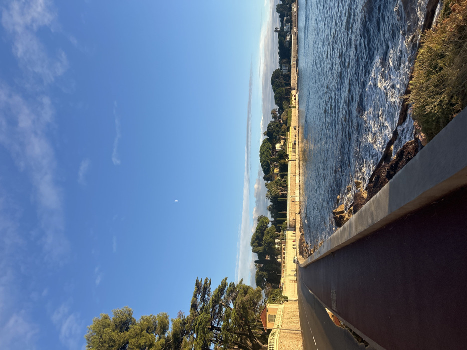 The image depicts a coastal scene in Antibes, France, under a clear blue sky with a visible crescent moon and scattered white clouds
