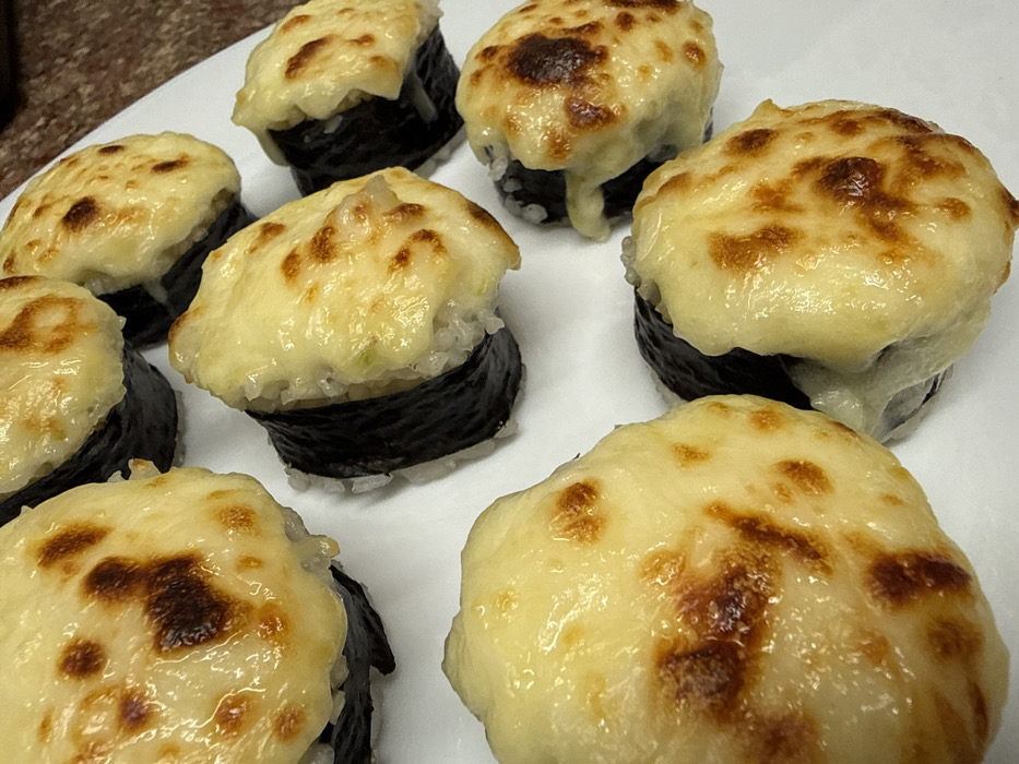 A white plate displays eight pieces of sushi. Each piece is wrapped in dark nori seaweed. The sushi rice is visible inside the nori. On top of each sushi piece, there's a generous, melted cheese topping that is slightly browned in spots, indicating it has been baked or broiled. The cheese topping gives the sushi a rich, creamy appearance.