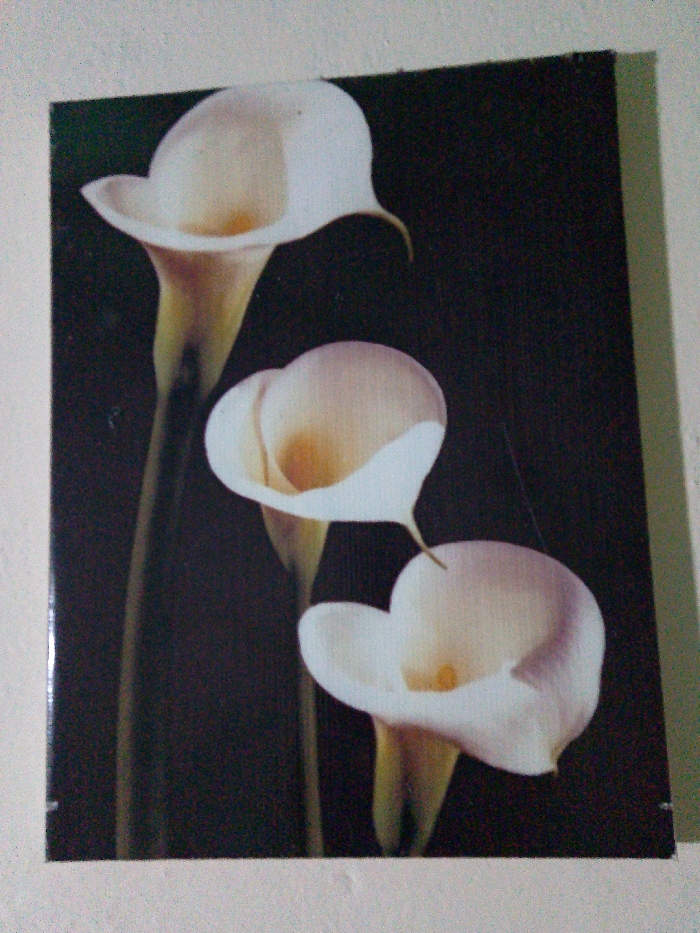 A rectangular artwork depicts three white calla lilies against a dark background