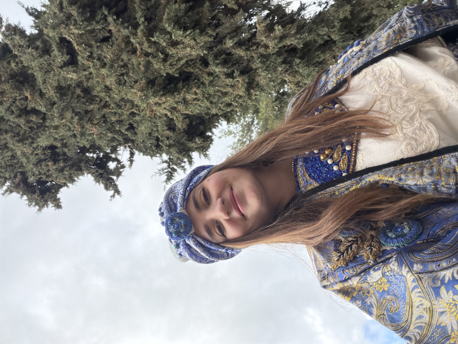 An outdoor, low-angle, eye-level shot in Safed, Israel, depicts a young adult female looking directly at the camera with a slight smile. She is positioned in the lower-center of the frame, from the chest up. Her light brown hair is long and straight. She wears a blue and gold patterned jacket with intricate embroidery, including gold leaf-like embellishments and blue beaded circular designs on the left side. Beneath the jacket, a cream-colored shirt with lace detailing is visible. A blue and white patterned turban-style headpiece with a central blue beaded medallion and additional smaller blue beads adorns her head. The background consists of a large, dense, dark green conifer-like tree occupying the right and upper portions of the frame, set against an overcast, light grey sky visible on the left and upper-left.
