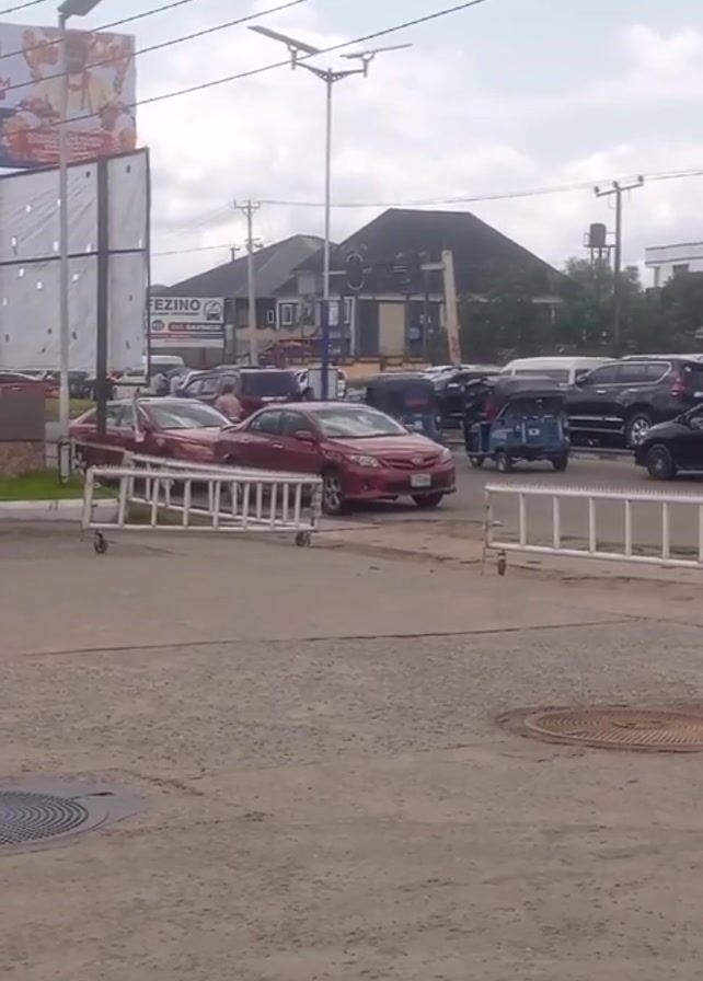 n outdoor scene during the day. The sky is overcast. The foreground is a paved area with a circular manhole cover. Two white metal barriers with wheels are positioned in the center of the frame. Behind the barriers is a busy area filled with various vehicles, including red cars, black SUVs, white trucks, and blue three-wheeled vehicles known as "keke." The vehicles appear to be in a parking lot or street with congested traffic. In the background, there are buildings, utility poles, and power lines. A billboard with advertisements is visible on the left side of the frame. Another billboard is seen further back and to the right. The overall impression is that of a busy urban environment with traffic.