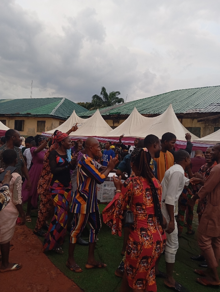 The image depicts a lively outdoor social gathering in Fegge, Nigeria