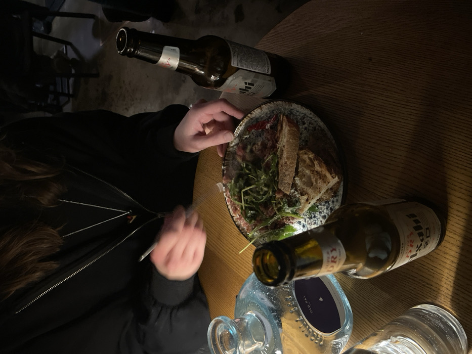 A dimly lit table displays a plate of thinly sliced meat, greens, and bread. Two empty beer bottles and two glass decanters surround the plate. A person's hands are visible near the plate, and they appear to be eating. The person wears a black jacket with a zipper. Parts of chairs are visible in the background. The table is a light wood grain.