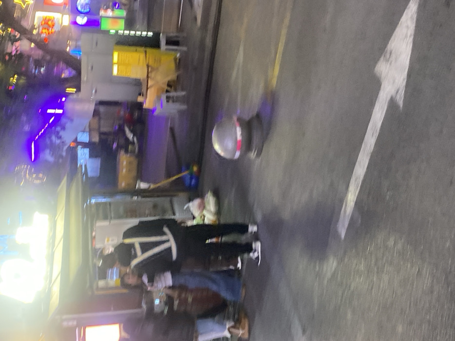 An outdoor shot captures a nighttime street scene. Two blurred individuals are in the lower frame. A person in a black and white jacket, with what appears to be white suspenders, is visible. Streetlights illuminate the background. A directional arrow is painted on the pavement. A transparent sphere sits on a grey base near the street edge. Buildings with illuminated signage add depth.