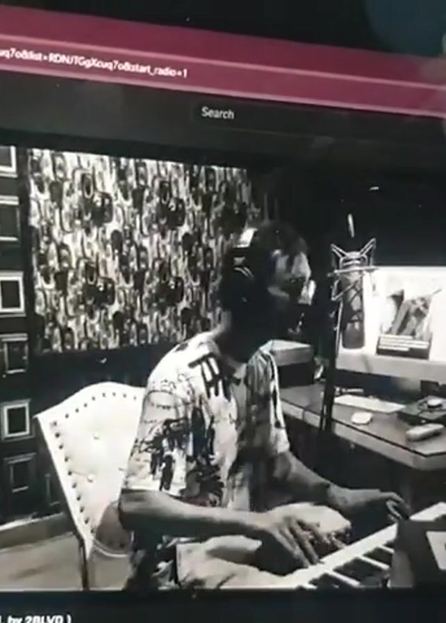 A video playing on a computer screen shows a black and white shot of a man in a recording studio. He is wearing headphones and a patterned shirt, sitting at a keyboard and playing. Behind him is a wall with framed images, and a computer monitor is visible to his right. The YouTube interface surrounds the video, showing the title "PAUSE - Zarni Chitan F Mnamu (Prod. by 2BLVD)" along with other video suggestions on the right side of the screen.