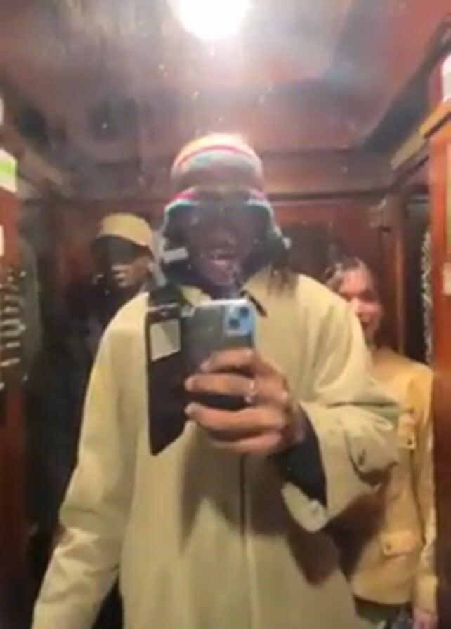 A man in a tan trench coat and colorful hat takes a selfie with his phone in an elevator with two other people behind him