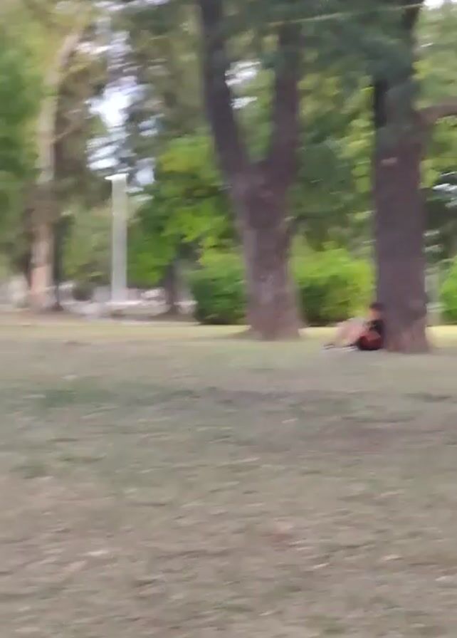 grassy park with several tall trees and people walking around with dogs. A person is sitting under a tree in the foreground. The camera then pans to show a group of people and dogs congregating near a small building with an orange and green accent wall. Some of the dogs are lying down, while others are walking around with their owners. The environment appears to be a public park with well-maintained grass and trees.