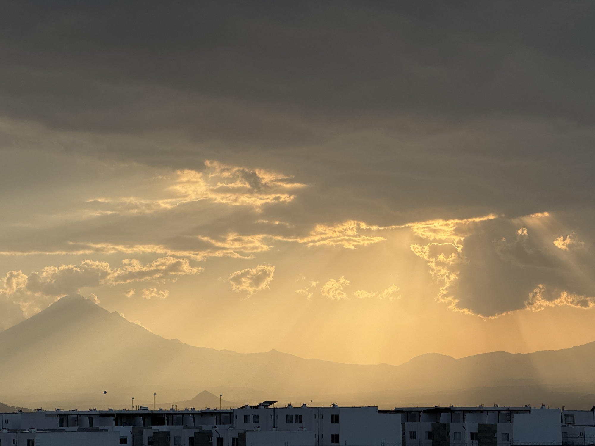 This image captures a wide-angle view of San Francisco Ocotlán (Ocotlán), Mexico, at sunset or sunrise. The upper sky consists of dark gray clouds, which transition into a luminous golden-orange expanse towards the horizon. The sun, obscured by a dense cloud mass, casts distinct crepuscular rays that penetrate through gaps in the clouds, illuminating the atmosphere and the distant landscape. A range of mountains forms the middle ground, appearing as a hazy, dark silhouette against the bright sky, with the highest peak visible on the left. In the foreground, the flat rooftops and upper levels of several white, multi-story buildings are visible. These structures feature dark window openings, and some rooftops are equipped with various fixtures including streetlights on poles and what appear to be solar panels or other utilities. No individuals are present in the visible scene.