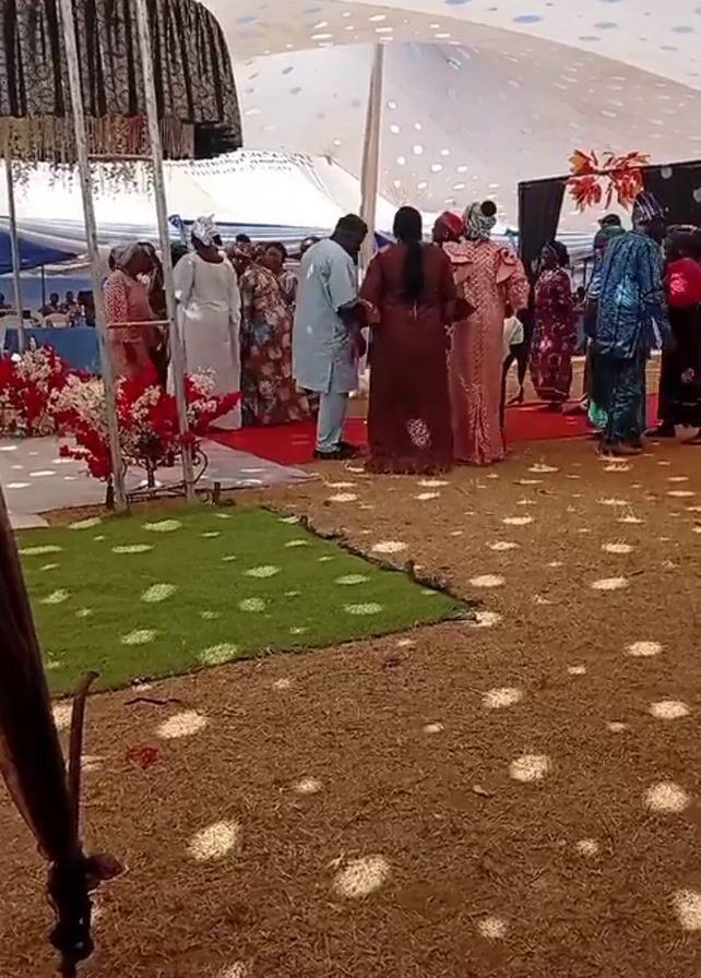 A camera films a crowded tent. There are several people standing and walking around. Most of them are wearing traditional African clothing. In the background are chairs and tables with more people. In the foreground there is a patch of artificial green turf and brown dirt that has been raked. The tent is white and has blue polka dots. There are black curtains on one side of the tent. The lighting inside the tent is bright.