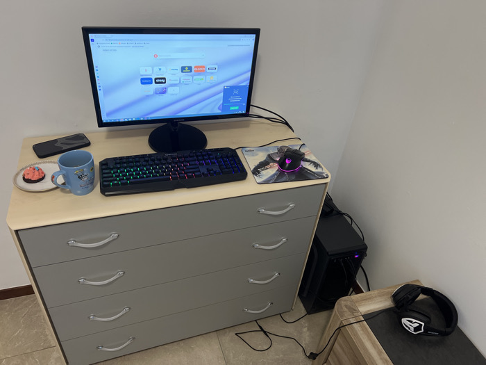 This image depicts an indoor workspace or gaming setup located in a corner of a room in Wegnez, Belgium. The central object is a light wood-topped, four-drawer grey dresser serving as a desk. On the dresser top, a black Samsung computer monitor is illuminated, displaying the Opera web browser start page. To the left of the monitor, a black smartphone rests near a light blue mug with a cartoon character design and a small white plate holding a pink-frosted cupcake. Directly in front of the monitor is a black mechanical gaming keyboard with multi-colored RGB backlighting. To the right of the keyboard, a black gaming mouse with pink RGB lighting sits on a mousepad featuring a dark-robed figure. Below and to the left of the monitor, a black desktop computer tower is situated on the floor, accompanied by a tangle of black cables connecting the various components. To the right of the computer tower, a small, light wood-grained end table with a dark surface holds a pair of black gaming headphones with white logo accents. The room features plain, light-colored walls and a light-toned tiled floor with a brown baseboard. No individuals are present, and no active human interactions or actions are depicted.