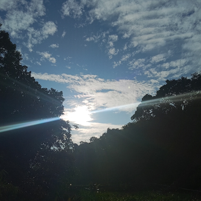 The image displays a natural outdoor scene captured in Cipanas, Indonesia. The dominant feature is a bright, obscured sun positioned centrally in the lower sky, emitting intense light that creates prominent diagonal lens flares across the frame. The sky above is blue with scattered white and streaky clouds. Dense, dark green trees form prominent silhouettes on both the left and right sides of the image, rising from a shadowed, indistinct foreground of vegetation. No human subjects, man-made objects, or specific actions are discernible.