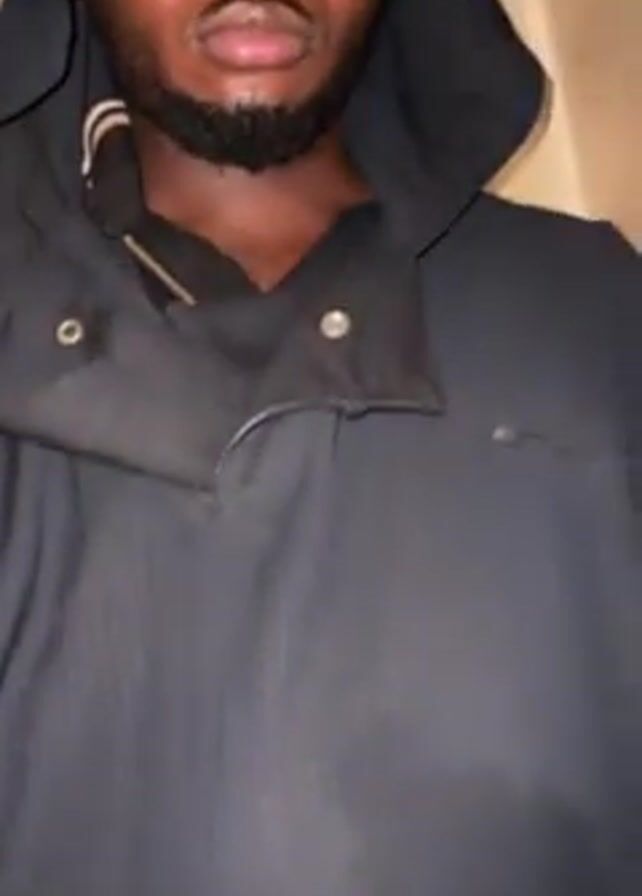 A man in a black hooded jacket and sunglasses holds a green glass bottle with a red and white label, drinks from it, and then stops. The man has dark skin and a beard. The bottle is partially obscured by the man's body. The background is a plain beige wall.
