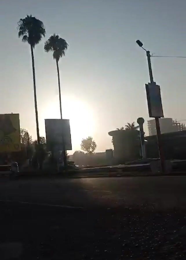 The video pans across an urban scene, likely early in the morning or late in the evening, given the low angle of the sun