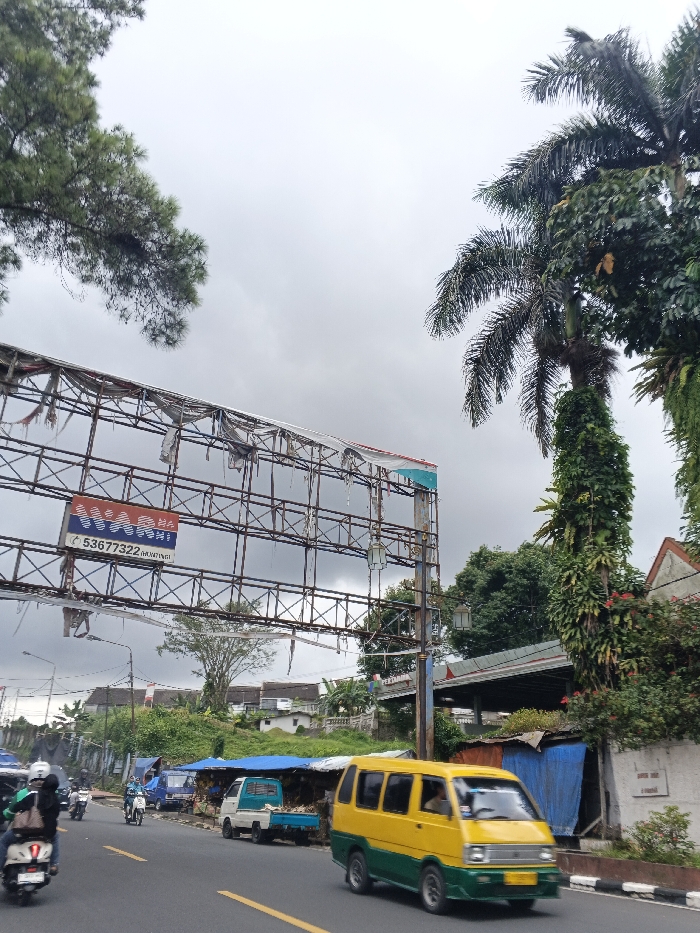 This image depicts a bustling street scene in Palayan, Philippines, under an overcast sky. The primary subjects are a road, various vehicles, a large dilapidated billboard, and dense tropical foliage. In the foreground, an asphalt road occupies the lower portion of the frame, marked with a yellow solid line on its right edge. A yellow and green passenger van, possibly a public utility vehicle, is in motion towards the viewer on the right side of the road, its front blurred due to movement. On the left side of the road, a white scooter with a rider wearing a green jacket and white helmet is moving away from the viewer. Further back on the left, another motorcycle carries two individuals, one wearing a light blue helmet. Additional vehicles, including a small light blue pickup truck with a cargo bed, are visible parked or slowly moving on the roadside. Dominating the left upper midground is a large, weathered metal billboard frame with tattered remnants of past advertisements. One section clearly displays a red and blue logo with text "NAKASHI" or "NAMASH," a phone number "53677322," and "MUNDING" below. Beneath the billboard, a raised embankment covered in green vegetation runs parallel to the road. Along the left edge of the road, several makeshift vendor stalls, covered with blue tarpaulins, are situated. Houses with various roof types are visible on the elevated terrain behind the stalls. On the right side of the image, two tall palm trees with dense green fronds extend into the sky. The trunk of the closer palm tree is heavily covered in vines or epiphytes. Beneath these trees, abundant green foliage and a building with a reddish-brown roof and a light-colored facade are partially visible. A utility pole equipped with several lantern-style streetlights stands to the right of the billboard structure. A low, striped black and white barrier or curb runs along the far right edge of the road. Overhead utility lines are visible across the sky.