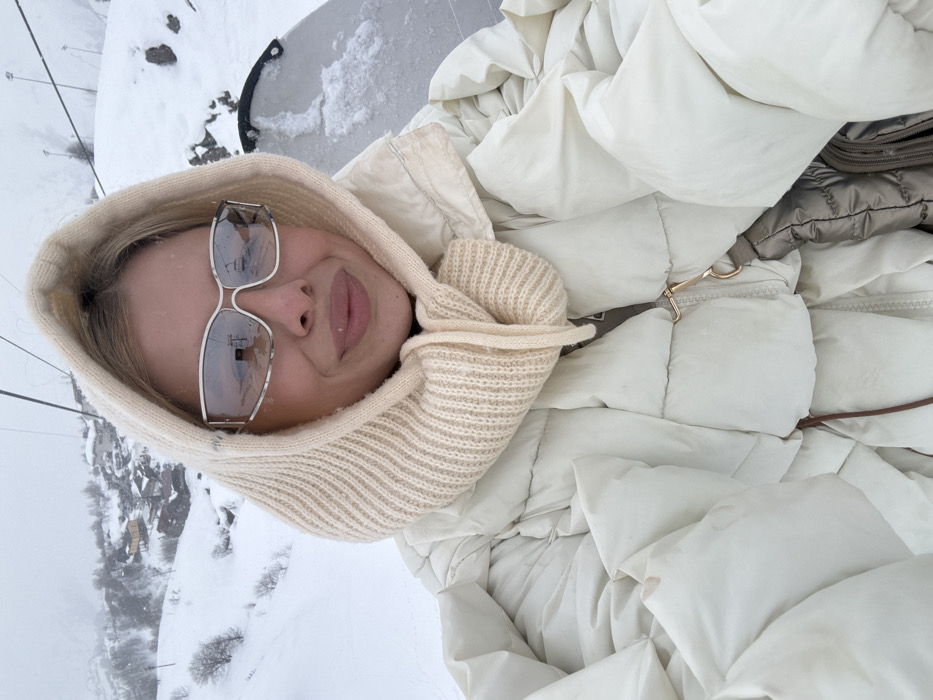 A female individual is depicted in a close-up selfie, situated on a ski lift within the snow-covered mountainous terrain of Gudauri, Georgia