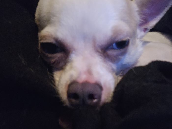 The scene is set in Hem, France. The image presents a close-up, frontal view of a small, light-furred canine, likely a Chihuahua. The dog has predominantly white fur, dark eyes that appear partially closed, and a pinkish nose and muzzle. Its left ear is partially visible, showing light pink skin and sparse fur. The dog's expression is neutral, appearing to be at rest. The subject is partially enveloped by a dark, soft material, possibly a blanket or fabric, which forms an indistinct, dark background. No other subjects, objects, or actions are discernible. The lighting is low to moderate, emphasizing the dog's face.