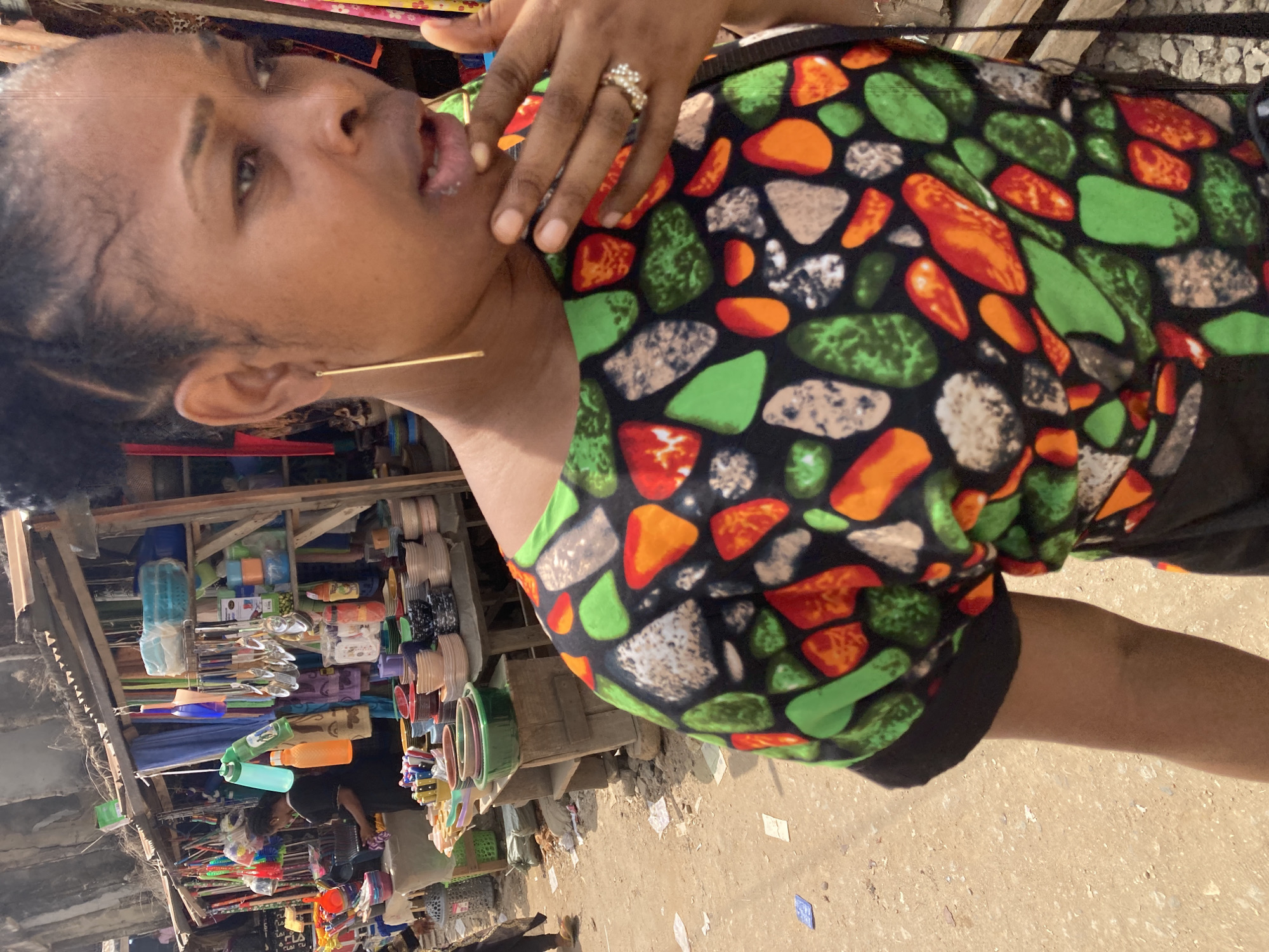 The image depicts an active market scene in Ura Nta Umuarandu, Nigeria, under bright daylight. In the foreground, a woman with dark skin and dark hair styled in braids is positioned slightly off-center to the right, looking away from the camera. She wears a black short-sleeved top adorned with a vibrant pattern of irregular shapes in green, orange, light brown, and black. A long, thin, gold-colored dangle earring is visible in her left ear, and she wears a ring with multiple small white beads on her left ring finger. Her left hand is raised, with fingers touching her chin/mouth area, which is slightly agape. The background reveals a bustling open-air market composed of multiple stalls with wooden frameworks and corrugated metal roofs. These stalls are densely packed with various household goods and kitchenware, including stacks of colorful plastic bowls, plates, mugs, spatulas, ladles, brooms, sponges, and plastic water bottles (light blue, orange), all displayed on tables and hanging from the structures. Another individual, partially visible in the mid-ground behind a stall, appears to be arranging items. The ground is unpaved, consisting of dirt and scattered debris, including small pieces of paper and what appears to be a blue tile shard. Distant, blurred buildings are visible beyond the market stalls.