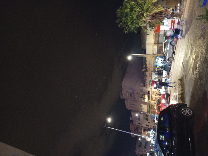 A nighttime street scene features buildings illuminated by storefronts and streetlights. Cars are parked along the right side of the street. A person is walking across the street. A palm tree is visible at the top. The sky is dark. The photo appears to be taken from a low angle and the image is rotated.