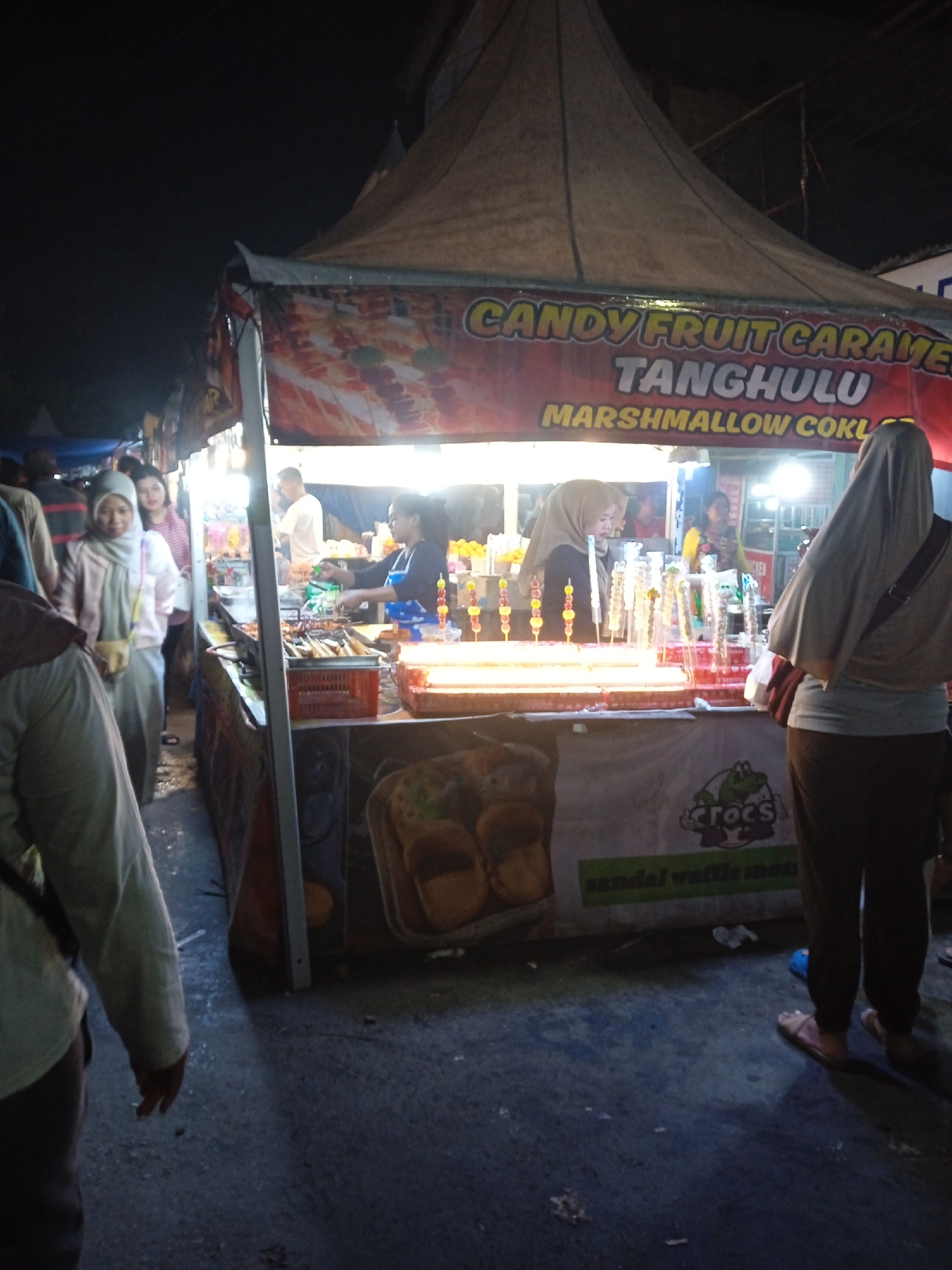 The image depicts a street food stall in what appears to be Kauman, Indonesia at night. The stall is selling "Candy Fruit Caramel Tanghulu" and "Marshmallow Coklat" as indicated on the banner. A woman wearing a headscarf is standing at the counter, apparently a customer. Another woman, wearing a headscarf, appears to be purchasing the item, with a worker standing behind the counter at the stall. A group of women can be seen to the left side of the stall. The stall is lit up, with skewers of the candy treats displayed. The stall front has an advertisement for "Crocs" and another ad that appears to say "sandal waffle." The ground is asphalt with bits of debris.