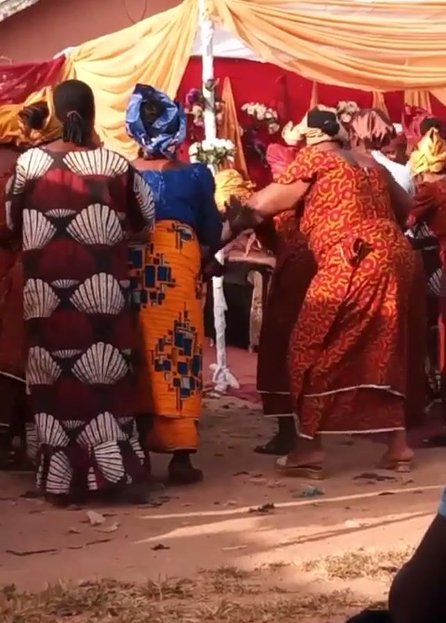 The video captures a group of women dancing at what appears to be an outdoor event, possibly a wedding or celebration, given the draped fabric and floral decorations in the background. Most of the women are wearing colorful, patterned dresses and headwraps, typical of African attire. They are dancing on a dirt ground. The camera is positioned from the side, showing the backs of some of the women. Other people are visible at the edges of the frame. There is a building with a red roof in the background.