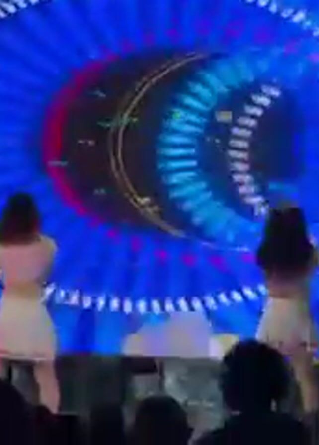 Two young women are performing on stage in front of a large LED screen displaying colorful, swirling patterns. They are both wearing similar outfits: a pink top and a white skirt. The audience is visible in the foreground, watching the performance. The screen displays an ever-changing pattern of blue, yellow, red and white lights, forming concentric circles. The stage is lit brightly.