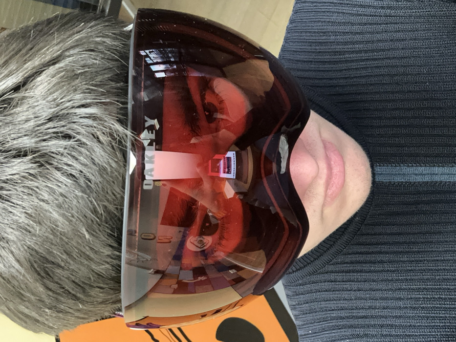 A close-up, head-and-shoulders shot features an individual with medium-length, slightly unkempt gray hair, wearing a dark, ribbed turtleneck-style top. The person's eyes and upper face are covered by large, red-tinted Oakley ski or snowboard goggles, with the 'OAKLEY' logo visible on the goggle frame above the left eye. The nose, mouth, and chin, showing light stubble, are visible below the goggles. Reflections on the goggle lenses display an indoor environment with vibrant, abstract graphic wall art, including reversed Cyrillic characters resembling "0 И M" (zero, Cyrillic letter "I", Cyrillic letter "M"), a window with horizontal blinds, and a rectangular mobile device with a white screen, likely being used to capture the image. The immediate background behind the subject features a striking orange wall with dark graphic elements, consistent with the reflected artwork. The scene takes place in a modern, public, or semi-public indoor space in Kyiv, Ukraine.
