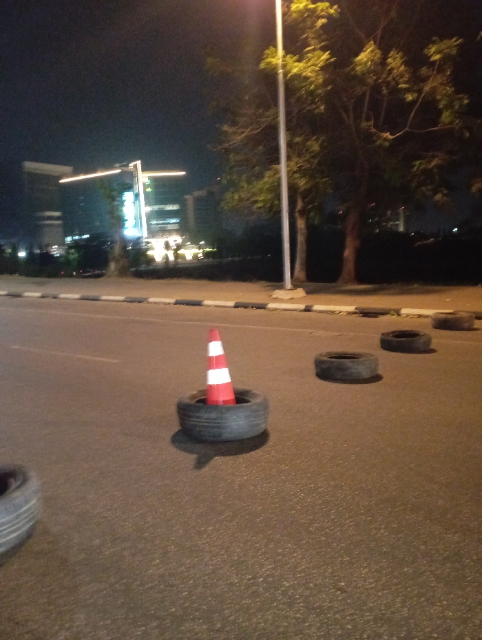 - "A nighttime shot depicts a deserted road with several tires lying flat on the asphalt" by FM-12xFB3, licensed under CC BY 4.0