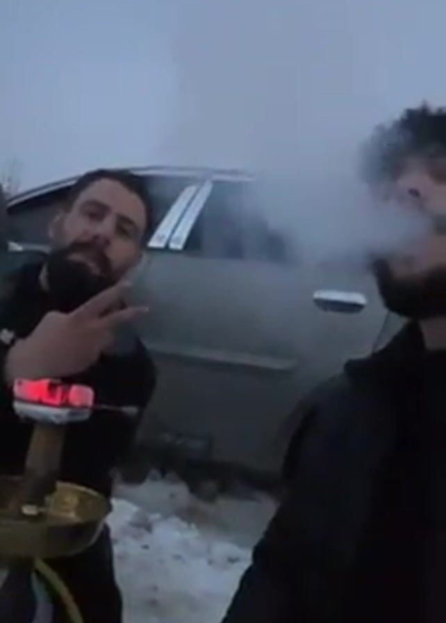 The video depicts a group of men outside in a snowy environment, possibly in the late evening or early morning due to the overcast sky and dim lighting. The men are dressed in dark clothing, and one is seen smoking from a hookah while another makes a peace sign. A silver car is parked nearby. The scene appears to be somewhat littered with empty bottles and a snack box in the snow. The background shows a few trees and what looks like a settlement on a hill. The camera movement is unsteady, suggesting it is handheld.