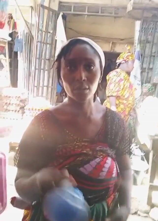 A woman is standing in front of a shop. She is wearing a patterned top and a white headband. She is holding a small blue object and talking. The background shows a cluttered shop with various items for sale, including balls and clothing. Another woman in a yellow patterned outfit can be seen behind her. The video is somewhat shaky and the lighting is bright.