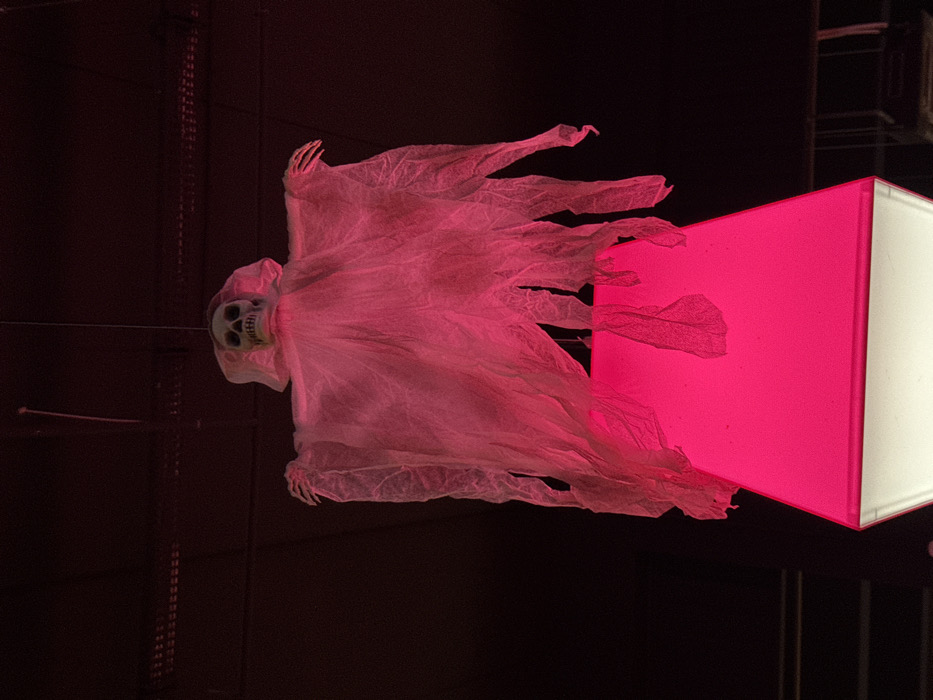 - "In Reichstett, France, an indoor scene displays a Halloween decoration consisting of a suspended ghost figure and a geometric light fixture" by FM-IL2Dl2, licensed under CC BY 4.0