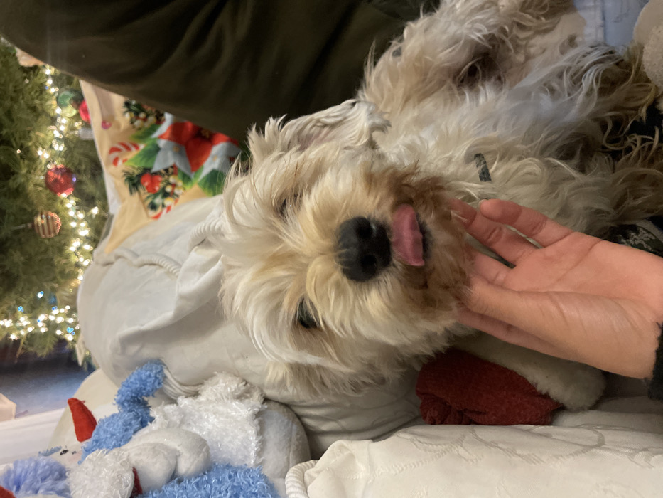 A fluffy, tan and white dog with a black nose licks its lips while being petted. The dog rests on a white surface amidst a blue and white stuffed toy and a red object. In the background, a Christmas tree adorned with lights and ornaments stands near a stocking with a festive, holiday-themed print. Someone wearing a dark green shirt is visible behind the dog.