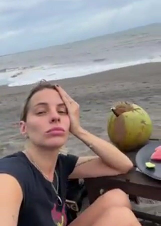 A woman sits at a small wooden table on a black sand beach. She wears a black t-shirt and silver necklace. Her blond hair is pulled back. She rests her hand on her forehead and looks at the camera with a bored expression. Next to her is a cut-open green coconut and a plate of fruit. Waves crash on the shore in the background under a cloudy sky.