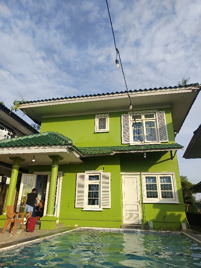 - "The image depicts a two-story lime green residence with a swimming pool in the foreground, located in Palasari, Indonesia" by FM-WRTkH2, licensed under CC BY 4.0