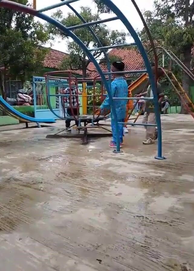 playground with children on and around the play equipment. There's a red-roofed building partially visible in the background, along with trees. The ground is concrete and appears wet. A metal structure resembling a climbing frame with a rotating element is the focal point. A child in a blue patterned shirt and pants stands next to it. Another child is already on the rotating part. Other children stand around. A slide and other play structures are visible in the background. The children appear to be playing and talking. The video is somewhat shaky.