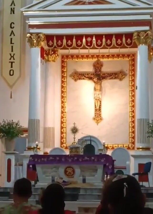 Inside a church, a crucifix hangs framed in gold against a white wall. Two white columns, adorned with gold on top, flank either side. In front of the crucifix is a table draped with purple fabric. A golden monstrance rests atop the table. To the left, a banner reads "SAN CALIXTO." A small child walks towards the altar. Several people sit in the foreground, with their backs to the camera. Potted plants are also visible.