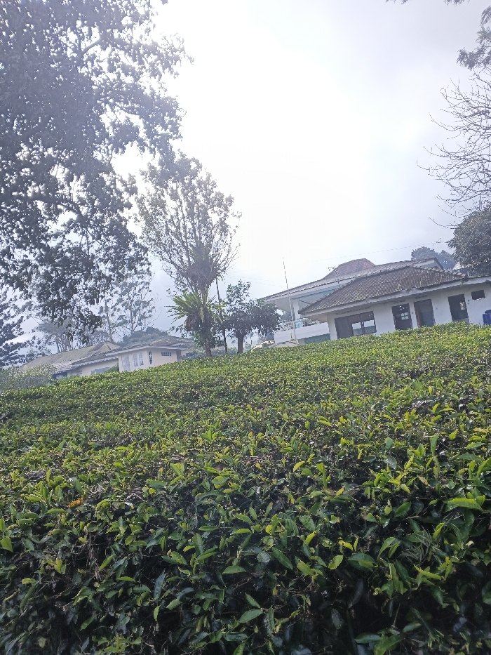 The image displays a panoramic view of a tea plantation ascending a gentle slope in the city of Unknown, Vietnam