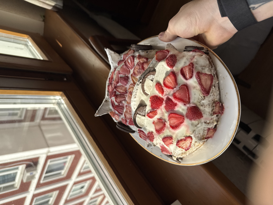 A human hand with a black wristband and partial forearm tattoo holds a white plate displaying an oblong dessert. The dessert is a multi-layered cake with white frosting, generously topped with sliced red strawberries and garnished with halves of dark-colored sandwich cookies (Oreos), arranged to resemble facial features like eyes and pointed ears, creating an animal or character motif. The cake is illuminated by natural light entering through a wooden-framed window. Outside the window, a multi-story urban building with red-brown walls and white window frames forming a distinctive diamond-patterned grid is visible. The scene is set indoors, looking out onto a residential area in Moscow, Russia.