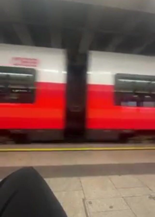 train passing by on a train platform. The train is red and white and moving quickly. The train station is underground, with grey tile floors. A person is sitting in a chair on the platform. The bottom of their black pants are visible. The sound of the train rushing by can be heard.