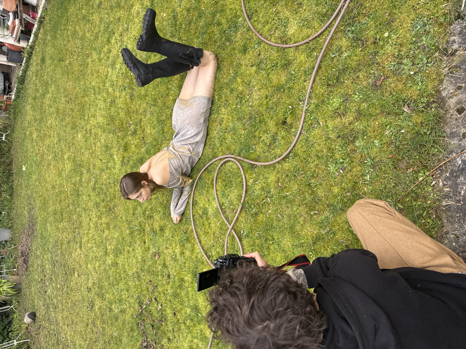 An outdoor scene in a private garden within the city of Vincennes, France, depicts two individuals. In the foreground, on the lower left, a person with dark, curly hair, wearing a black hooded sweatshirt and tan trousers, is crouched, holding a black digital camera with its articulated screen open, aimed towards the midground. A light brown garden hose traverses the grassy area, forming a loose figure-eight shape between the subjects. In the midground, a female subject with medium-length brown hair lies prone on the green grass, facing left. She is dressed in a shimmering, light-colored, off-the-shoulder, long-sleeved dress and tall, black, lug-soled boots. Her legs are bent at the knees with feet elevated. The ground consists of green grass interspersed with patches of moss and weeds. The background reveals a garden setting with potted plants, a fence or wall, and various outdoor items along a perimeter.