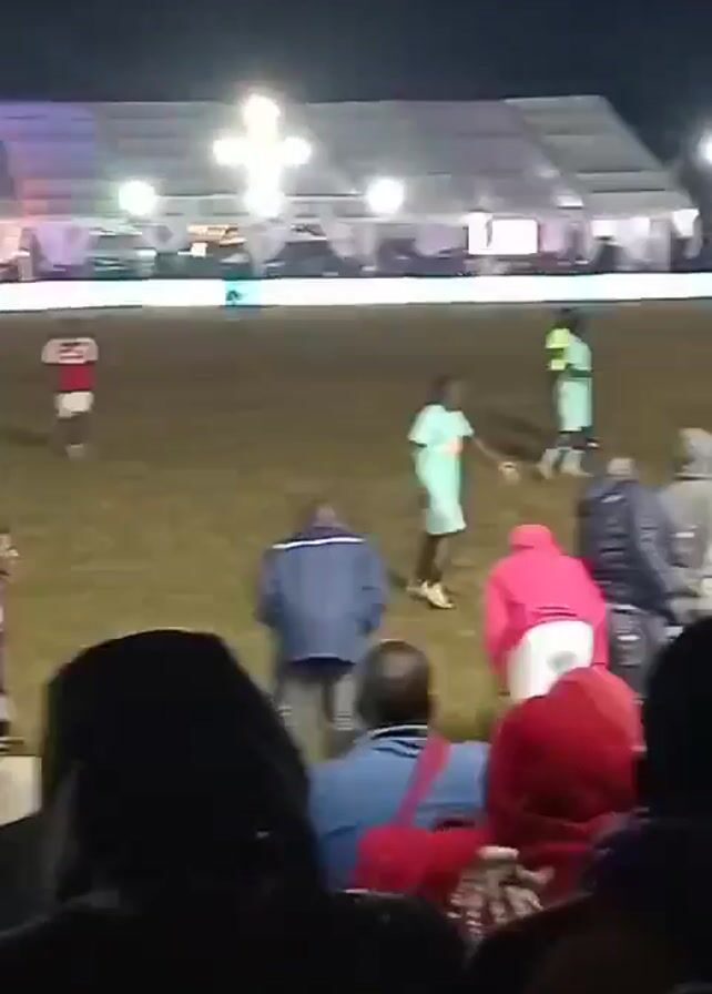 soccer game taking place at night. The field is lit by bright spotlights. A large, white tent stands behind the field. People are standing and sitting in the foreground, watching the game. Players in light green jerseys and red jerseys are visible on the field. A referee in a yellow shirt is also present. People walk around in front of the camera. Signage reading "CLEO MALALA" is visible behind the field.